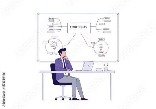 Flat Illustration Man Thinking about Core Idea on Whiteboard at Workplace