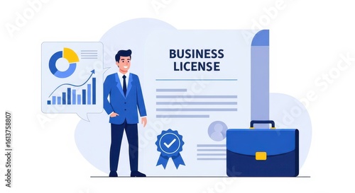 Flat illustration of a businessman proudly stands next to a business license document, briefcase, and analytics chart