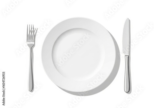 Flat illustration of a clean white plate with a fork and knife arranged for dining, isolated on a white background
