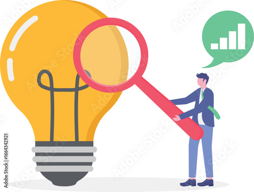 Flat illustration of business people discovering bright idea under magnifying glass spotlight teamwork innovation creativity and solution insight