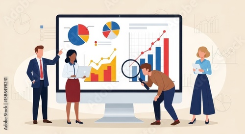 Flat illustration of business professionals analyze data and financial charts on a large computer screen during a team meeting