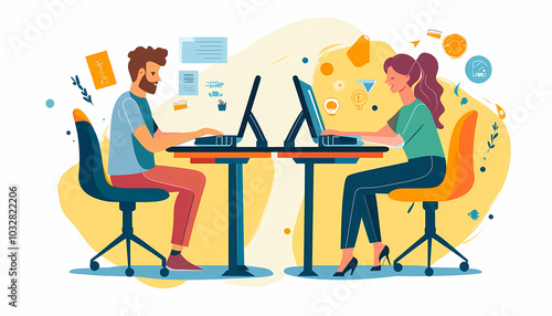 Flat illustrations of two people working together at their desks, with one person sitting on the left side and another woman seated to his right., Flat illustration style with simple shapes and lines,