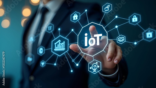 Flat IoT technology and wireless connectivity concept featuring businessman interacting with IoT interface displaying icons for AI global networking industrial automation cybersecurity solutions and s