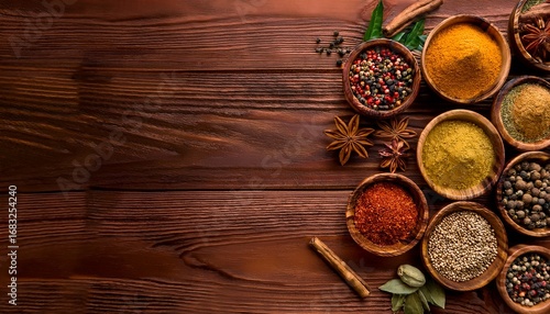 flat lay background cover banner image of various spices in wooden bowls on a wooden table with copy space