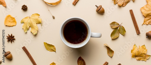 Flat lay composition with colorful Autumn cup of coffee and leaves on a color background. top view