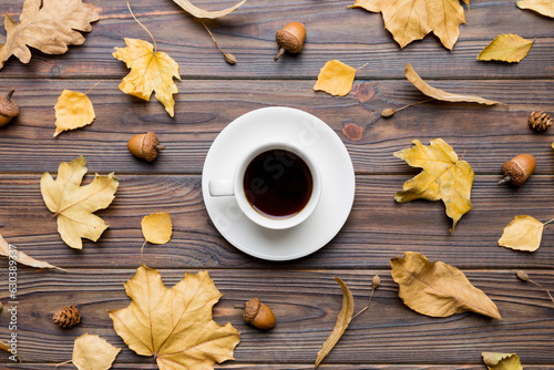 Flat lay composition with colorful Autumn cup of coffee and leaves on a color background. top view