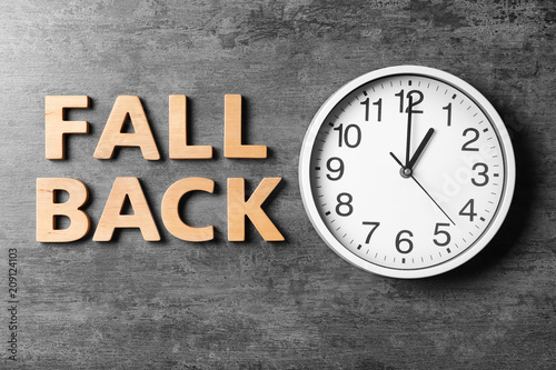 Flat lay composition with modern clock and words FALL BACK on grey background. Time management