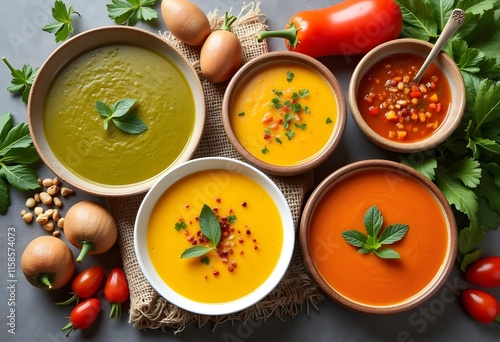 Flat lay composition with various soups and ingredients on wooden background. Healthy food