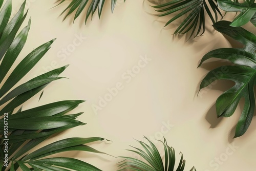 Flat lay frame with palm green leaves on beige background with copy space. desktop wallpaper with palm leaves. backdrop or green leafy tropical forest patterns for design elements.