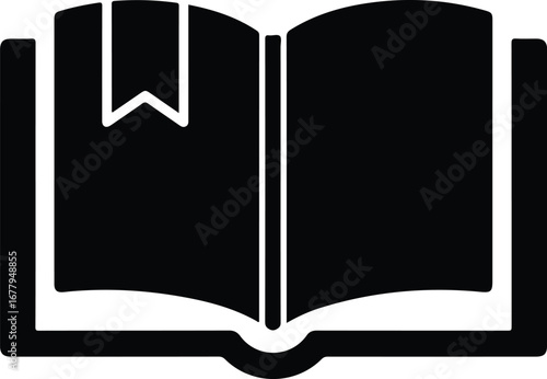 Flat lay of a simple black open book icon on a white background with a bookmark.