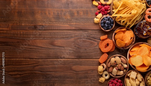 Flat lay of a wooden table with healthy snacks like nuts, fresh berries, and carrot sticks o