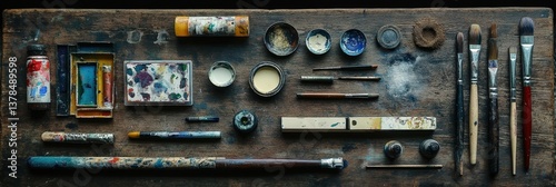 Flat lay of gouache painting tools on a rustic wooden table with creative chaos