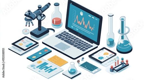 Flat lay of scientific research tools, including microscope, beakers, test tubes, laptop, tablets, and graphs, representing modern laboratory practice.