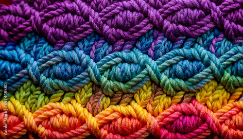 Flat lay surface colors of rainbow macrame lace is a unique fabric that is produced using the knot weaving technique, panoramic view