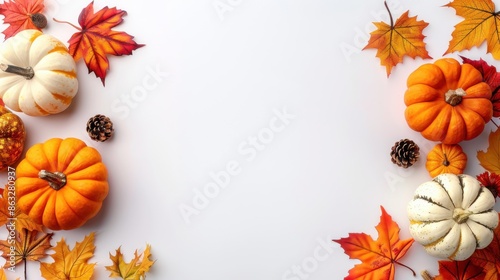 Flat layout of dried leaves, pumpkins, and flowers arranged on a white background, creating a festive and autumnal composition.