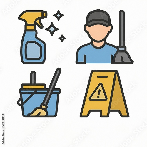 Flat style cleaning service icon set featuring a spray bottle,cleaner person with mop,bucket with cleaning tools,and caution wet floor sign,in blue and yellow colors