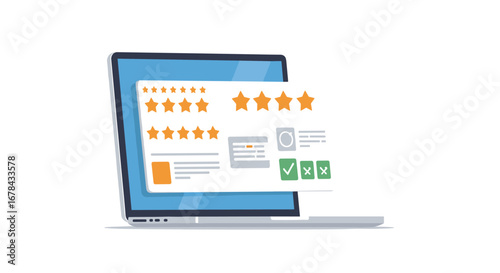 Flat style laptop with customer review interface and rating stars