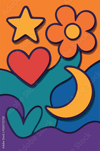 Flat vector colorful paper cutout style with bold chunky outlines and flat layered shadows