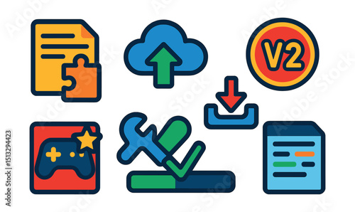 Flat vector icons of game updates: patch notes, update cloud, install icon, version badge, new feature icon, game fix icon, download progress, changelog document.