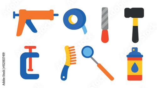 Flat vector icons of repair and maintenance tools: adhesive gun, thread tape, metal file, rubber mallet, mini clamp, wire brush, inspection mirror, lubricant spray.