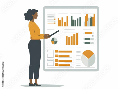 Flat Vector Illustration of a Person Using a Tablet for Digital Financial Analysis on a White Background - Emphasizes Modern Business Practices for Finance Software Advertising.