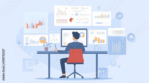 Flat vector illustration of an IT professional sitting at their desk, surrounded by data visualizations and graphs on the screen