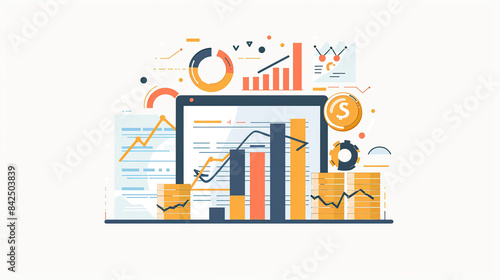 Flat vector illustration of financial data visualization charts and coins on a white background, in a flat design style with simple lines and shapes