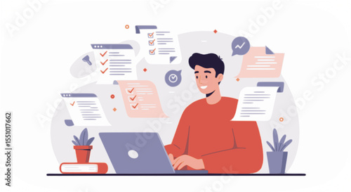 Flat vector illustration of happy young businessman using a laptop with floating digital documents and checklists around him, modern workspace background, soft pastel colors