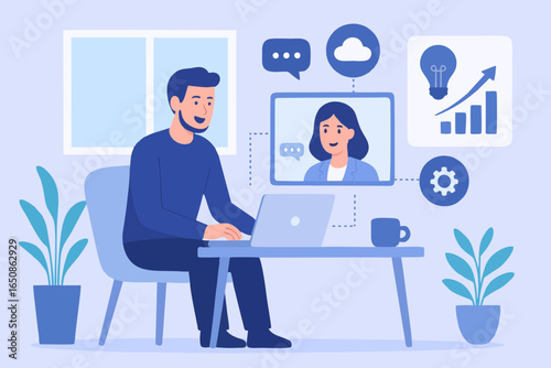 Flat vector illustration of people having online video call meeting, digital communication, and remote teamwork.