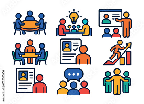 Flat vector line icons of business meeting and collaboration: conference table, team brainstorming, presentation, HR discussion, employee evaluation, career growth, resume review, group chat,