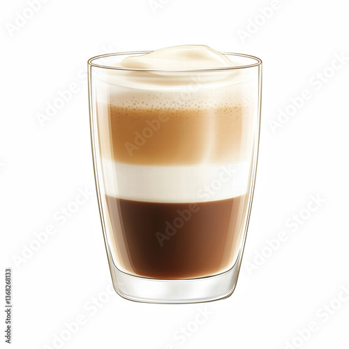 Flat white coffee in a transparent glass with layered espresso, steamed milk, and silky foam, creamy café drink isolated on transparent background