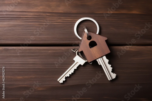 Flat wooden key paired with a house - shaped keychain placed on a dark wooden background.