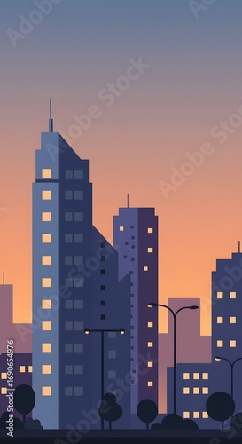 Flat-vector illustration of a modern city skyline at dusk with simple shapes and muted colors.