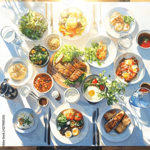 Flavor harmony at golden hour a wide shot of a beautifully arranged table with diverse dishes in sync outdoor dining experience