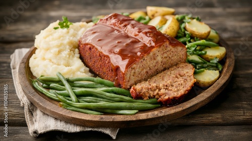 Flavorful Plant-Based Meatloaf with Tomato Glaze, Mashed Potatoes, and Green Beans on Rustic Table Setting