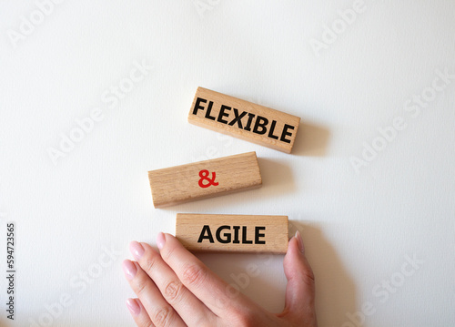 Flexible and agile symbol. Concept word Flexible and agile on wooden blocks. Beautiful white background. Businessman hand. Business and Flexible and agile concept. Copy space