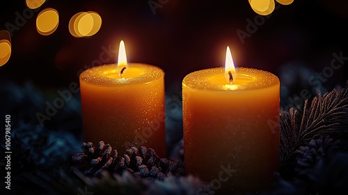 Flickering candles glow in the dark, with church lights in the background, adding a festive touch to Christmas Eve or Chanukah.
