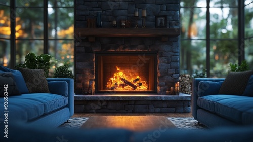 Flickering flames cast a warm glow in a serene living space, with plush sofas framing a comforting hearth surrounded by greenery