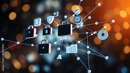 Floating 3D business icons, such as briefcases, dollar signs, and pie charts, connected by a web of lines, symbolizing global business networks