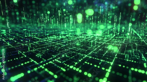 Floating 3-D datum flow with neon green binary cipher atom , hacker gridiron , 2025 cut , Tron inspired
