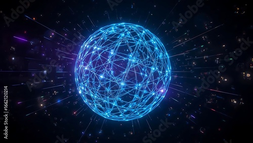 Floating abstract holographic sphere with Futuristic glowing data lines. cyber particle swirl, deep data brain system.