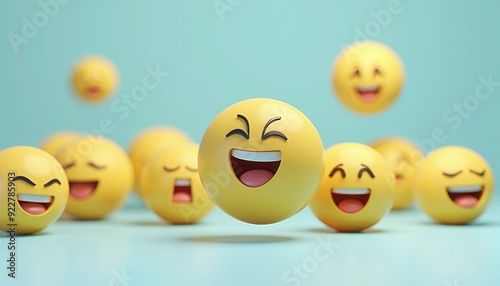 Floating and glowing emoji faces expressing joy and laughter against a blue background.