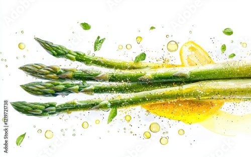 Floating asparagus spears with a drizzle of olive oil and lemon zest, vibrant spring vibes, bright white background