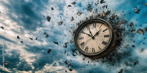 Floating clock against a chaotic sky, symbolizing the surreal nature of time.