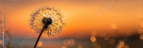 Floating Dandelion Clock Glows Against a Stunning Golden Sunset Sky Capturing the Essence of a Serene Evening Moment Generative AI