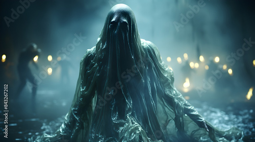 Floating evil ghost spirit in an empty and foggy horror spooky Halloween illustration representation