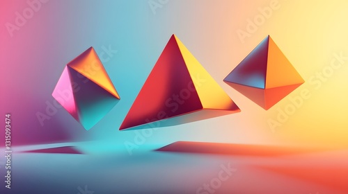 Floating Geometrical Forms:Three iridescent metallic pyramids and octahedron float against a vibrant, multicolored backdrop, creating a visually striking and abstract composition.