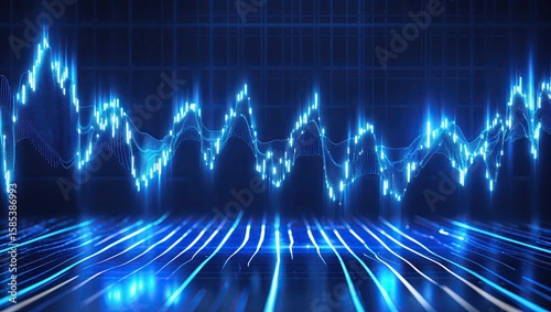 Floating glowing blue bars forming waveform in 3D grid space, with sine-wave overlay and grid floor