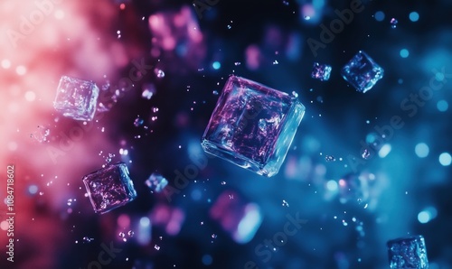 Floating ice cubes in vibrant colors, abstract background with blue and pink hues, sparkling effects, 3D rendering