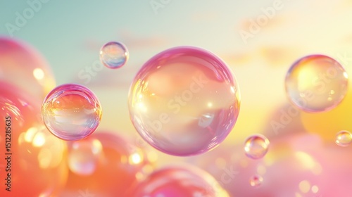Floating, iridescent bubbles in pastel colors against a soft, sunlit sky